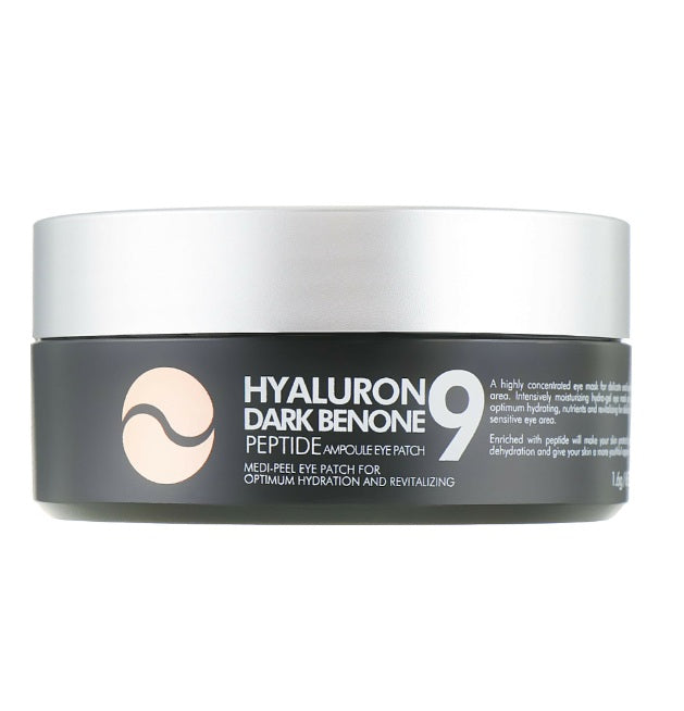 Revitaliza tu mirada con un boost de hidratación y luminosidad. Hyaluron Dark Benone 9 Peptide Ampoule Eye Patch de Medi-Peel combina el poder reafirmante de los péptidos con antioxidantes y ácido hialurónico para iluminar, hidratar y reducir los signos de fatiga en el contorno de ojos.